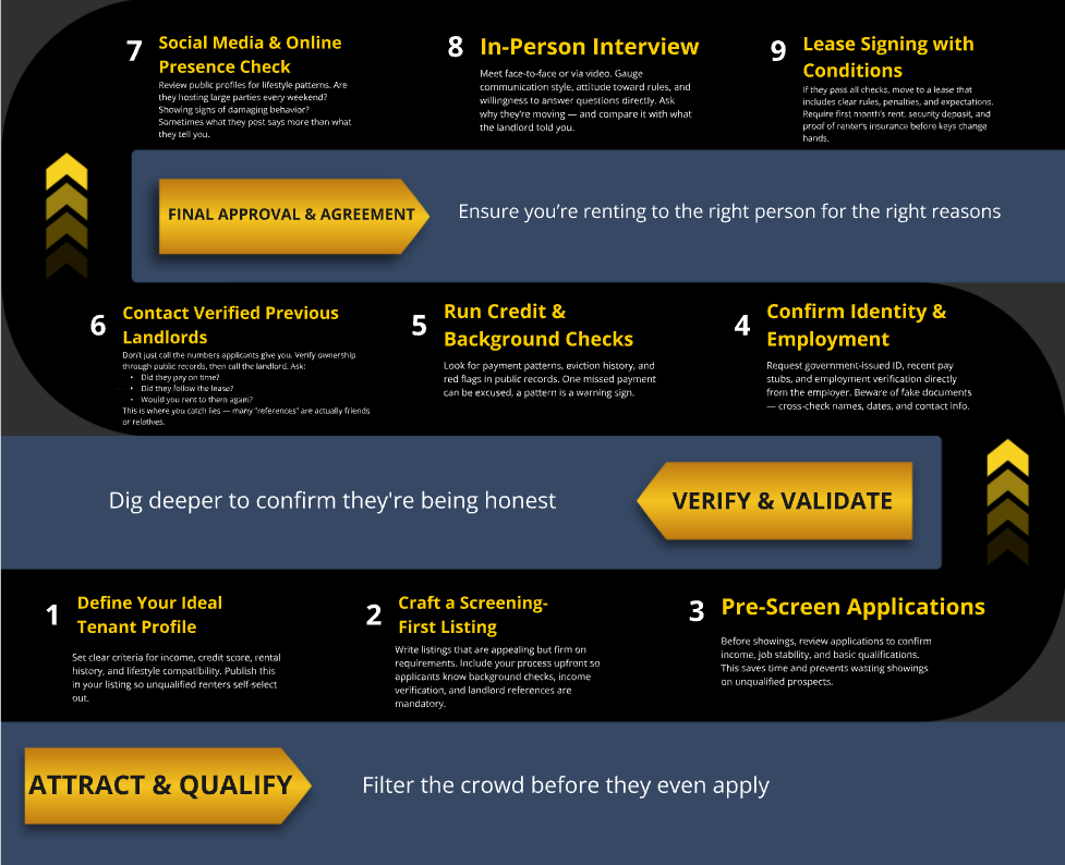 Set clear criteria for income, credit score, rental history, and lifestyle compatibility. Publish this in your listing so unqualified renters self-select out.